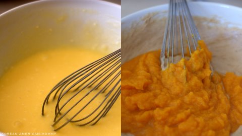 4. In a large bowl, whisk together the agave, vanilla, eggs substitute and butter. Add the dry ingredients and whisk until smooth. Then whisk in the butternut squash puree. My batter was a little dry so I added a little almond milk and Organic canned pumpkin.